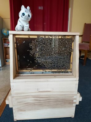 In diesem Jahr dreht sich am Tag der offenen Tür alles um das Thema Biene. Da darf ein Besuch eines echten Imkers natürlich nicht fehlen. Am 24.09.2019 war Imker Daniel in der Adolf-Reichwein-Schule zu besuch und er hatte viele kleine Bienen mitgebracht. Angst musste natürlich keiner haben, das er gestochen wurde. Die Bienen war hinter einer Glasscheibe und so konnten alle Kinder sie in Ruhe betrachten und die Bienenkönigin suchen.