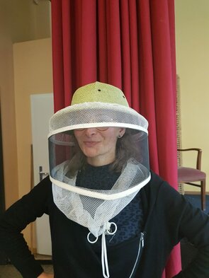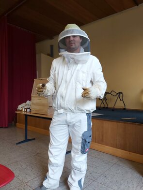 Imker Daniel erzählt vieles über die Bienen und warum sie so wichtig sind. Ohne Bienen gab es nämlich kaum Äpfel oder Erdbeeren. Er zeigte uns sein Werkzeug und seinen Schutzanzug, den einige Kinder auch anpobieren durften. Die Kinder hatten viele Fragen an den Imker und wollen jetzt antürlich noch viel mehr zum Thema Biene lernen.
