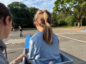 Heute fand auf unserem Schulhof und dem Sportplatz des GSV das große Sport- und Spielefest statt. Auf dem Schulhof warteten zahlreiche Spielmöglichkeiten auf die Kinder – darunter verschiedene Fahrzeuge zum Fahren und eine große Hüpfburg, die für viel Spaß und Bewegung sorgte.