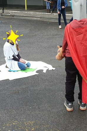 Am heutigen Tag feierte die Reichweinschulgemeinde den diesjährigen Martinstag einmal anders. In zwei Zeitschienen trafen sich die 1. und 2. Klassen sowie das 3. und 4. Schuljahr auf dem Schulhof, um ihre selbstgebastelten Laternen zu präsentieren. Einige Mädchen und Jungen des 4. Schuljahres bereiteten ein kleines Martinsspiel vor, dem die Kinder lauschten. Sie verfolgten gespannt, wie unser „Martin“ seinen Mantel mit dem „Bettler“ teilte. Das „Teilen“ spielt in unserer Schulgemeinde immer wieder eine wichtige Rolle. Vom ersten Schultag an werden die Kinder dazu ermutigt zu teilen; sei es Mitgefühl und Interesse sowie auch gerne einmal ein Butterbrot mit einem Freund geteilt wird, der sein eigenes Brot zuhause vergessen hat. Den Aspekt des Teilens griffen alle Klassen nach dem Martinsspiel in ihrem Klassenraum noch einmal auf. Ein großer Weckmann wurde mit allen Kindern geteilt und gemeinsam gegessen. Auch dies gehört mittlerweile zur Martinstradition an der Reichweinschule. Dank geht an den Förderverein, der dies ermöglicht. Fazit: dieses Martinsfest war klein, aber fein!