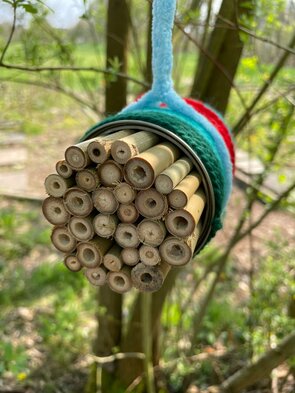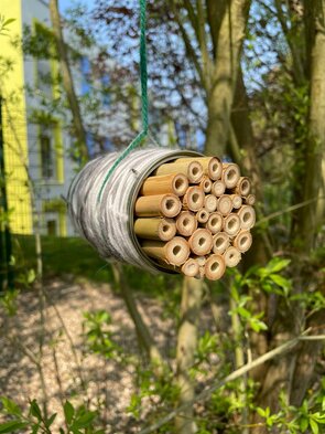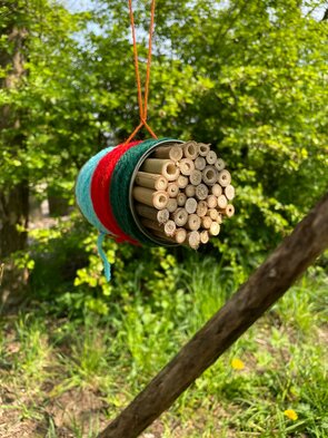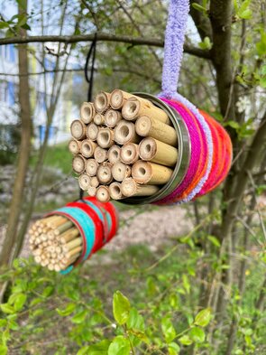 Um die Insekten bei ihrer Arbeit zu unterstützen, haben heute einige Kinder bunte Insektenhotels aus Konservendosen und Bambusstäben hergestellt. Unsere Insektenhotels dienen sowohl als Nisthilfe als auch als Unterschlupf zur Überwinterung. Durch die Nutzung von wiederverwendeten Konservendosen leisten wir zudem einen kleinen Beitrag zur Müllreduzierung. Vielleicht entdeckt ihr ja beim nächsten Besuch des Schulgartens unsere kleinen, bunten Insektenhotels.