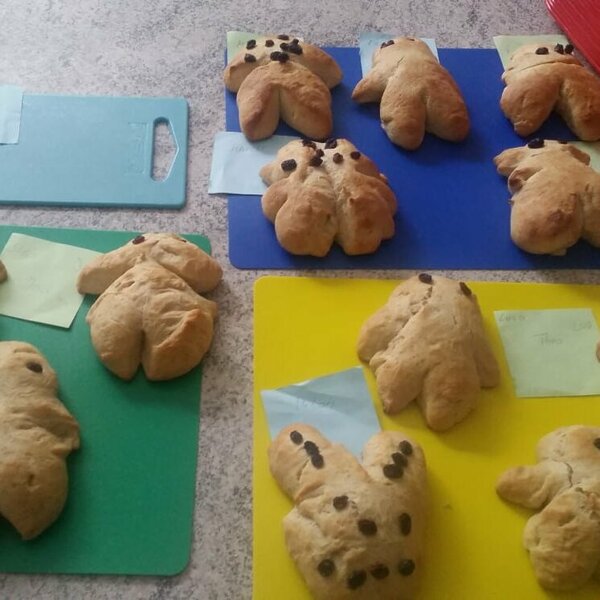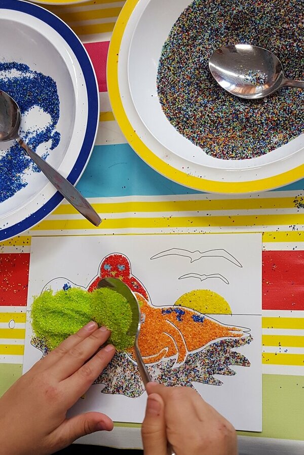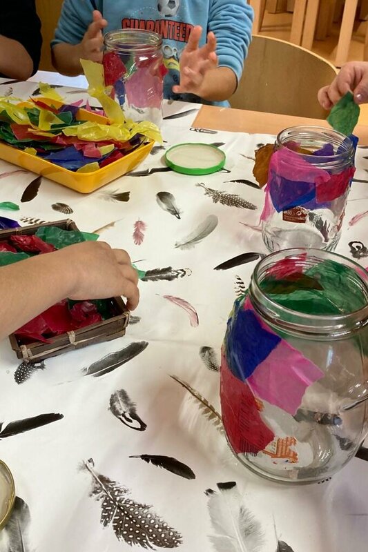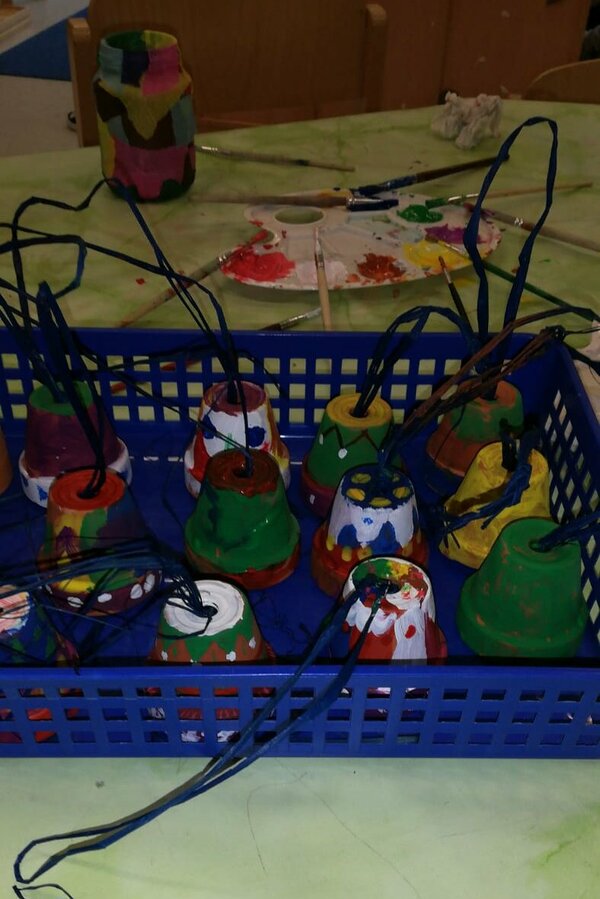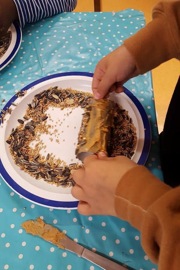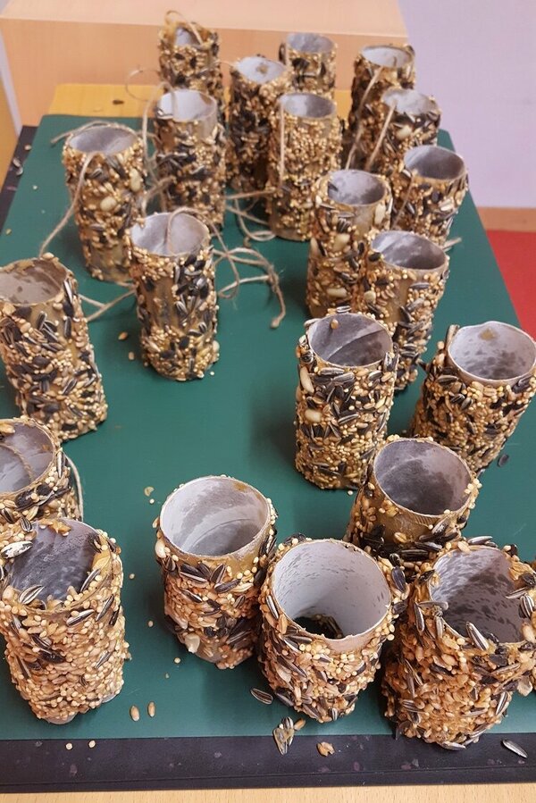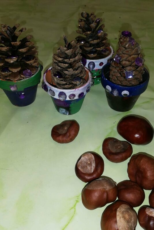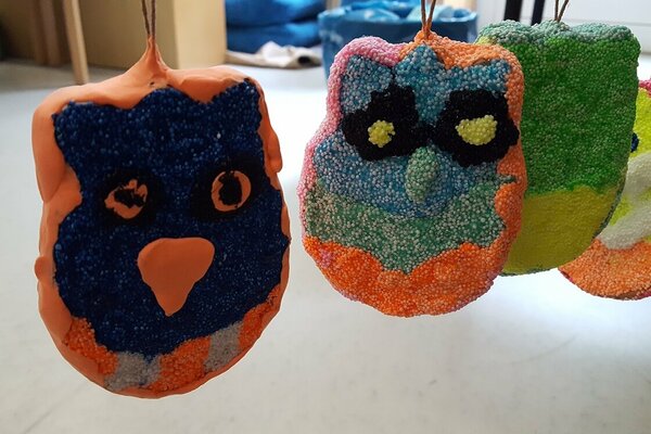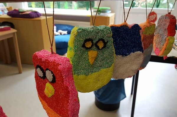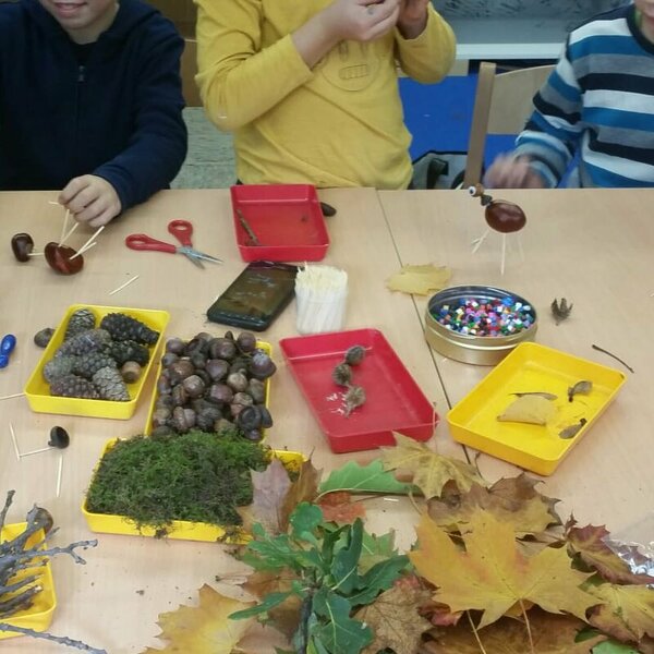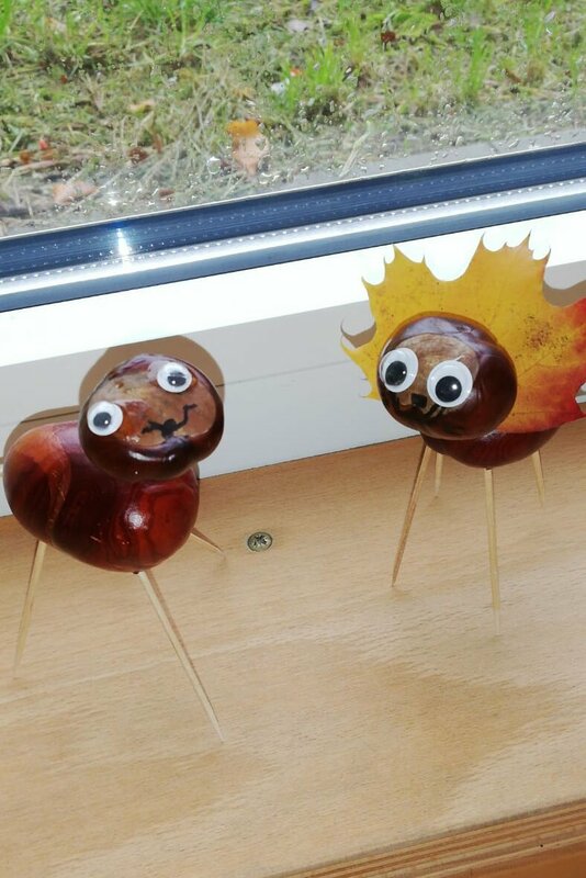 Unsere Herbstferien: es war bunt und gemütlich. Während der Ferienbetreuung in der OGS hatten die Kinder viel Spaß an den Angeboten und kreativen Aktionen. Wir haben z. B. tolle Sandbilder hergestellt, ganz individuelle Steine und Tontöpfe bemalt, Teelichtgläser gestaltet und lustige Kastanientiere gebastelt. Außerdem haben wir Vogelfutterstangen hergestellt und draußen aufgehängt, damit die gefiederten Freunde in der kalten Jahreszeit etwas zu essen haben. Wie begeistert waren die Kinder, als bereits am nächsten Tag die Fußspuren der Vögel auf den Stangen zu sehen waren. Die Pickspuren zeigten, wie es ihnen geschmeckt hat. Natürlich gab es auch für uns Menschen etwas Leckeres: gemeinsam mit den Kindern haben wir Muffins gebacken, Tee getrunken, ausgiebig gefrühstückt usw.