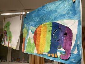 In der Projektwoche beschäftigen wir uns mit Elmar und seinen vielen bunten Abenteuern. Da wir Zebras ja nur schwarz und weiß sind, fanden wir Elmars buntes Muster direkt richtig toll! Zuerst hörten wir die Geschichte von Elmar und malten Elmar und seine bunte Elefantenherde am Elmartag im Dschungel. Dazu übten wir fleißig selber die Tiere zu lesen und ein Suchsel zu lösen. Elmar erlebte noch viele andere Abenteuer und wir betrachteten Bilderbuchkinos. Zu der Geschichte „Elmar und das Monster“ bastelten wir in Gruppenarbeit Stabpuppen und spielten die Geschichte als Stabpuppentheater nach. Zum Abschluss der Woche dachten wir uns selber neue Abenteuer von Elmar aus und schrieben und malten dazu.
